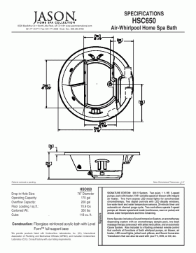 The Jason HSC 650 spa bathtub is designed to be the centerpiece of a health-and-wellness room, family room, solarium or bathroom. The HSC650 spa tub has room for up to three people with convenient features such as tri-level seating, separate controls for dual therapy and dual heaters to maintain water temperature. This jetted tub also features an automatic aromatherapy dispenser and sound immersion system to complete the ultimate spa bath experience. Call 800-720-1062 for more details.
